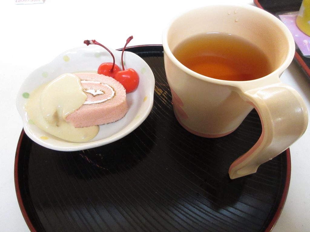 おやつの時間にはロールケーキにクリームとサクランボを添えて