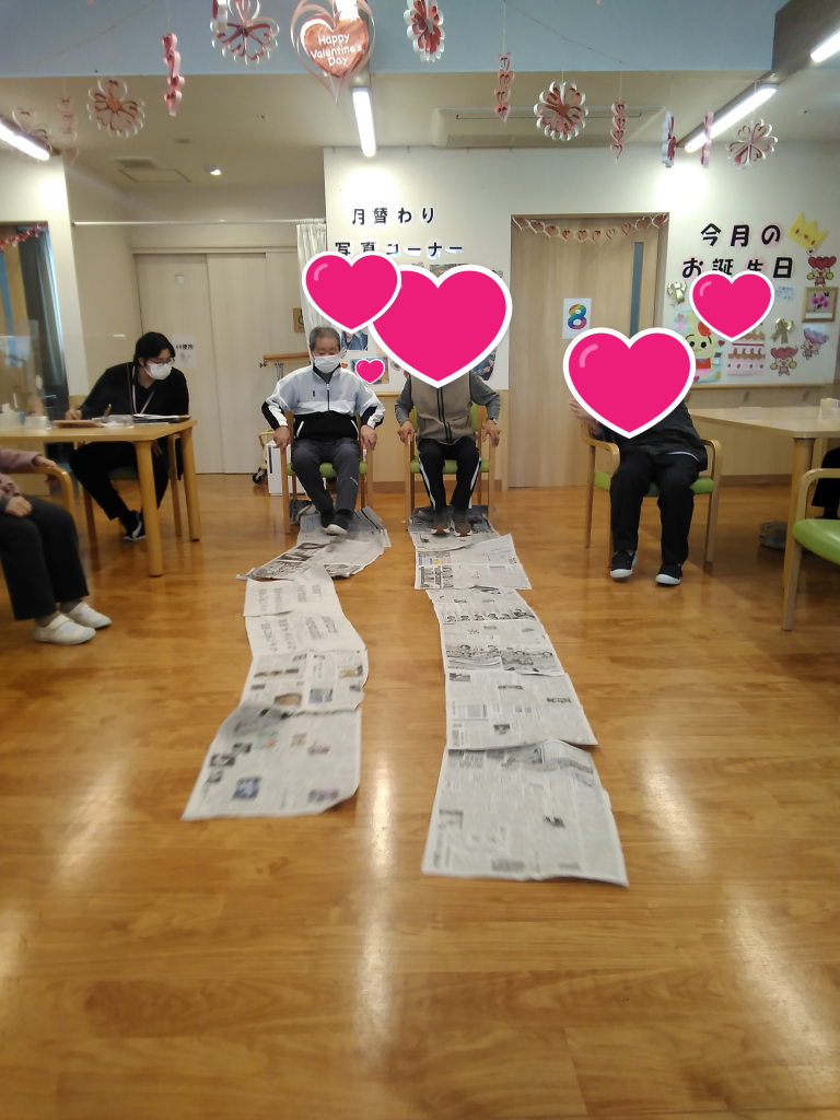 今日のレクは、足を使って、新聞巻取り勝負をしました☆