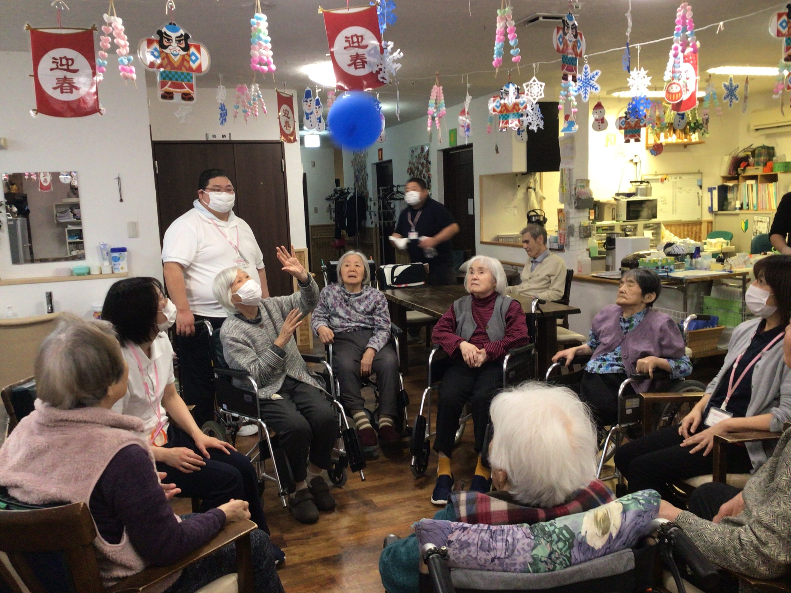 皆さんで輪っかになって風船バレーをしました!
