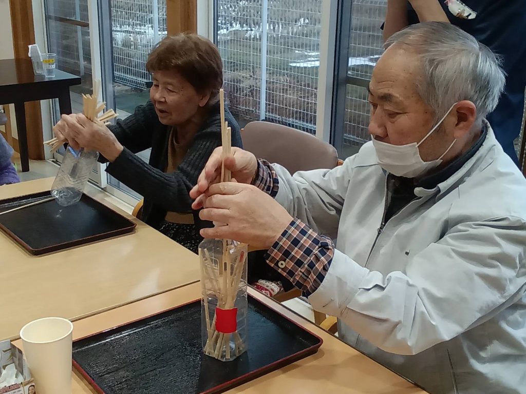 今日のレクリエーションは「時間内でペットボトルに割り箸を何本入れられるかゲームです」。