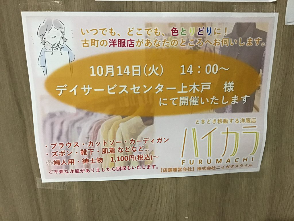 14日、火曜日は古町の洋服屋さんが訪問販売に来所されます👔