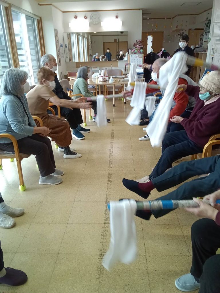 今日のレクリエーションは、棒を使ってタオルを投げ合い、キャッチするゲームの様です。