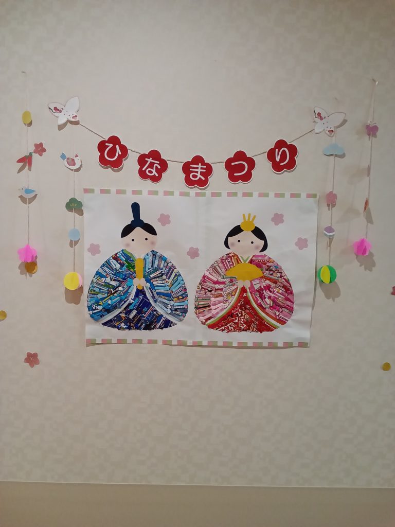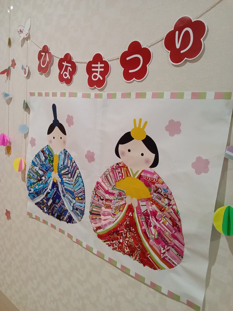 こちらの壁面飾りの中心にいるお内裏様とお雛様の衣装は紙やチラシが貼られているのですが、貼り付けはお客様にも協力して頂きました!
