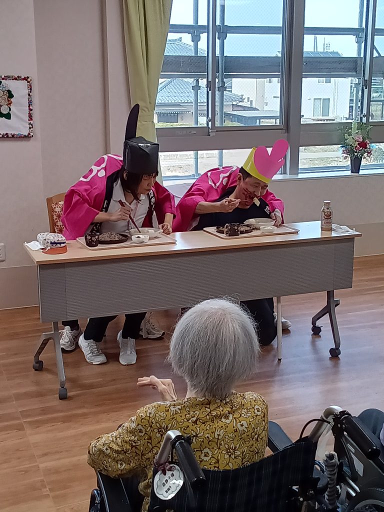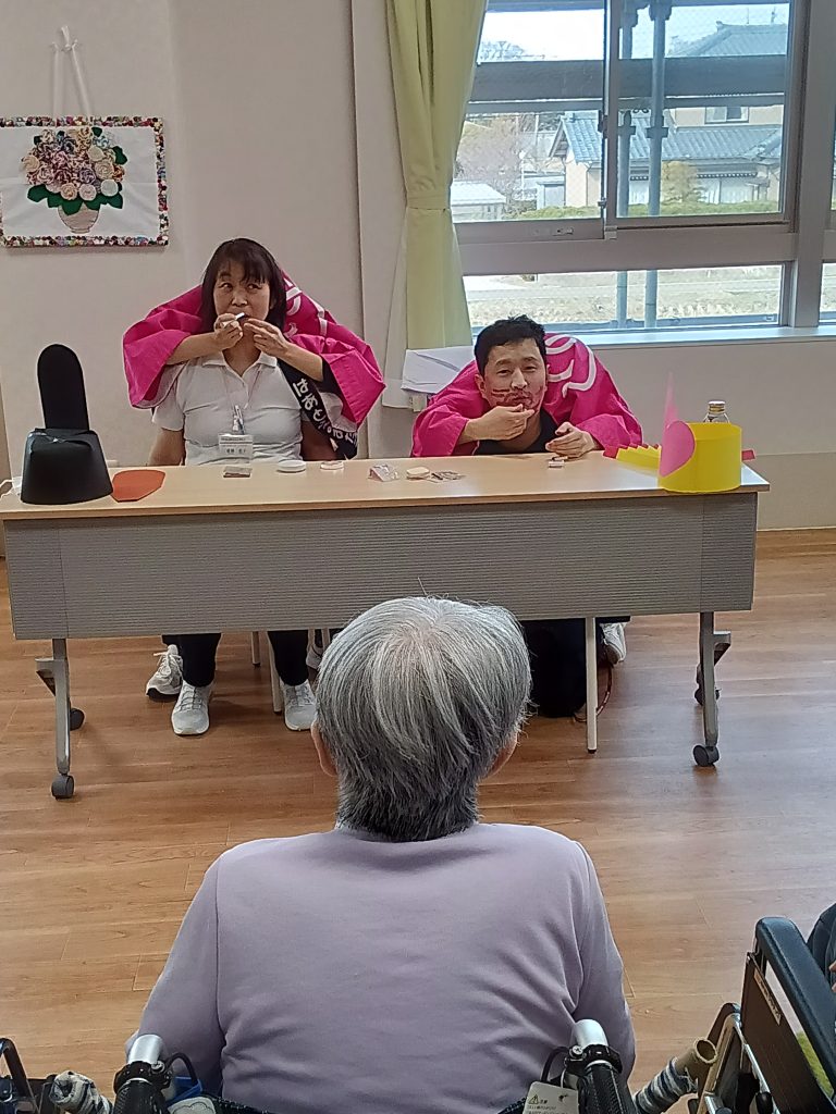 イベントでは職員による二人羽織でのお化粧や飲食を披露しました。