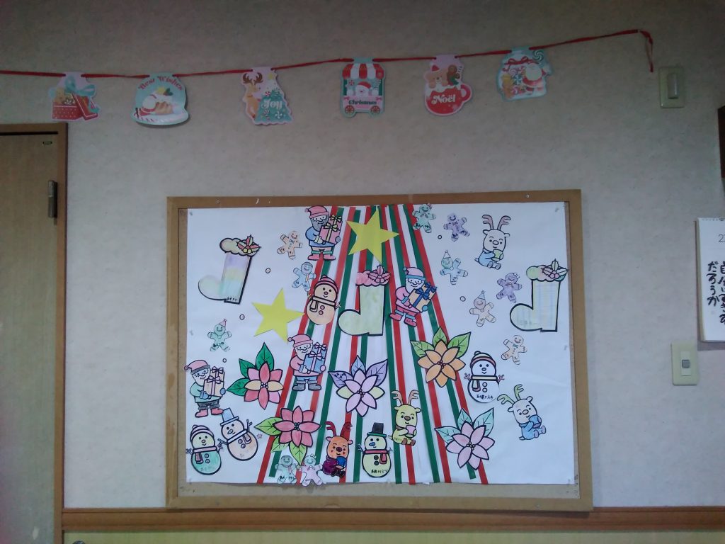 手作業週間でみなさんが塗られた絵を飾り付けたり、キラキラ☆彡ツリーなど沢山の作品も掲示しております。