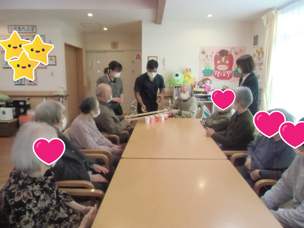 昨日のレクは 昨日のレクは『二人チームバトンリレー』 二人で力を合わせてバトンを開いて紙コップにピンポン玉を落として点数を競いました( ´∀` ) 偶然男性どおしが同チームになりました! 周囲の応援も大盛り上がりでした!