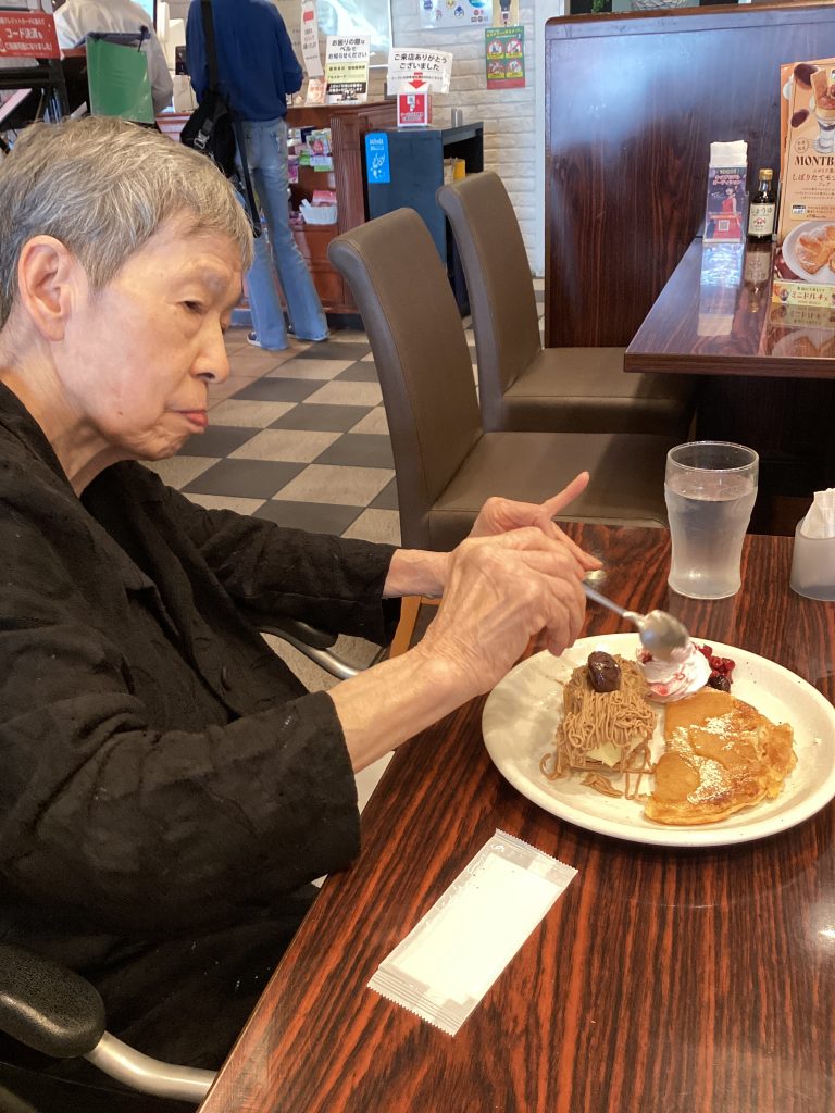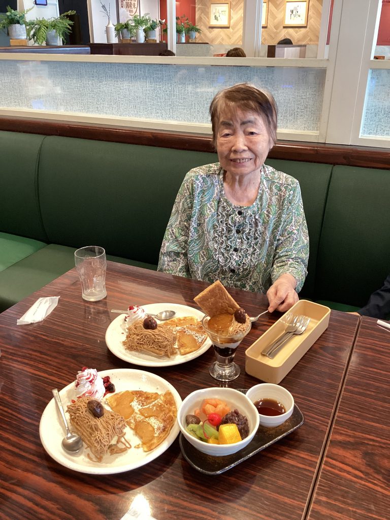 10月行事🍨 デイサービス栞では毎月行事を行なっています♪ 今月は外出おやつ行事です‼️ お店の前でいい笑顔☺️❤️ 名目は「おやつ」ですが、もちろん好きなものを食べてオッケーです👌 秋の味覚もしっかり味わってきました😋
