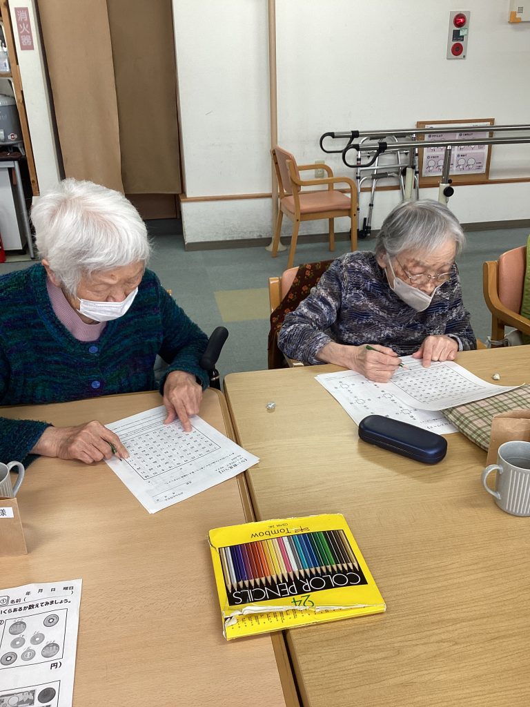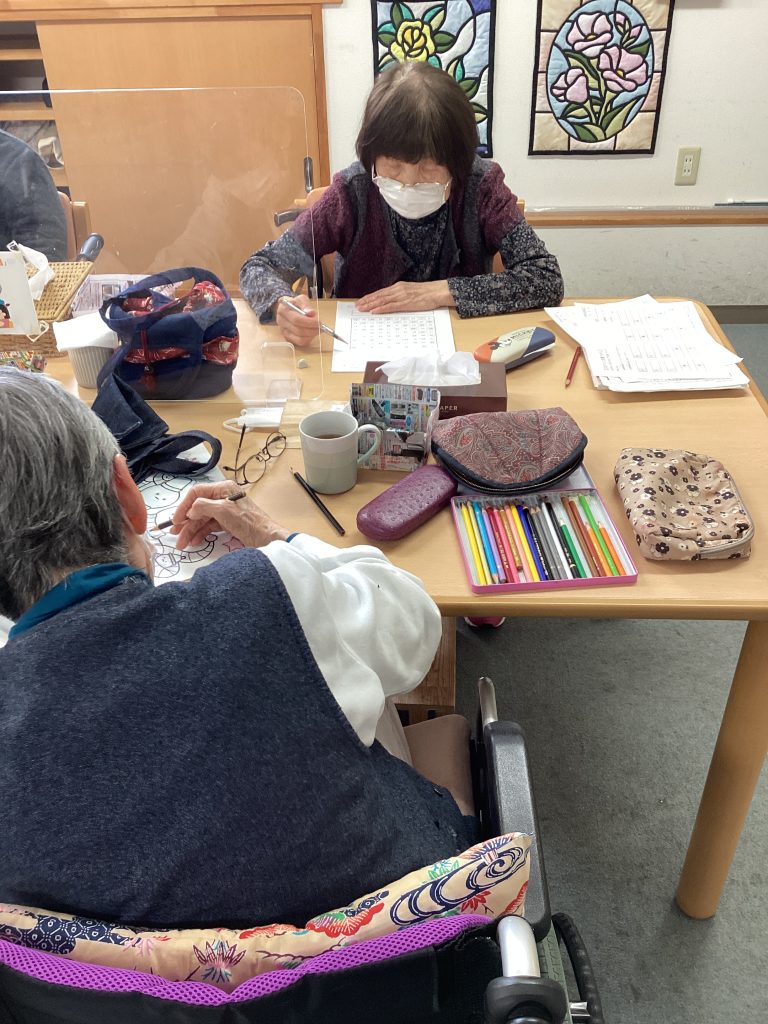 午後の時間⏰ デイサービス栞のお客様は熱心な方が多いです🔥 脳トレをされている方や… (職員でも苦戦するような問題に一生懸命取り組まれています😂✨) 塗り絵、間違い探しなど、 頭や手先を使う作業に取り組まれています✨ 「あっという間‼️」「もうこんな時間‼️」 と、みなさま充実した時間を過ごされています😁