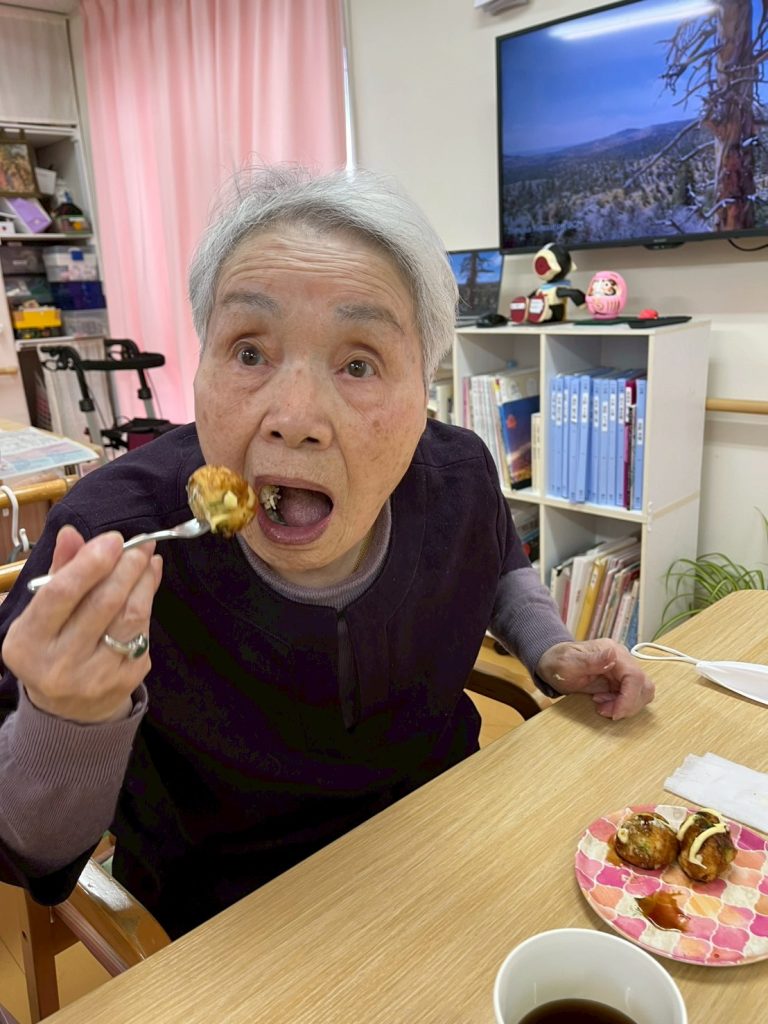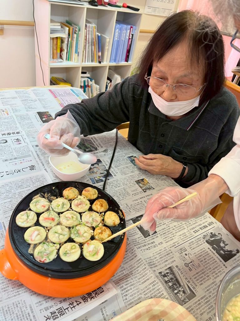 たこ焼きパーティー🌟 こんにちは!デイサービスセンター浦山です。 11日、おやつレクにてたこ焼きパーティーを行いました🐙 今回はたこの代わりにカニカマが入っております! 油は多めでカリカリに焼くのがポイントです 美味しくできました!