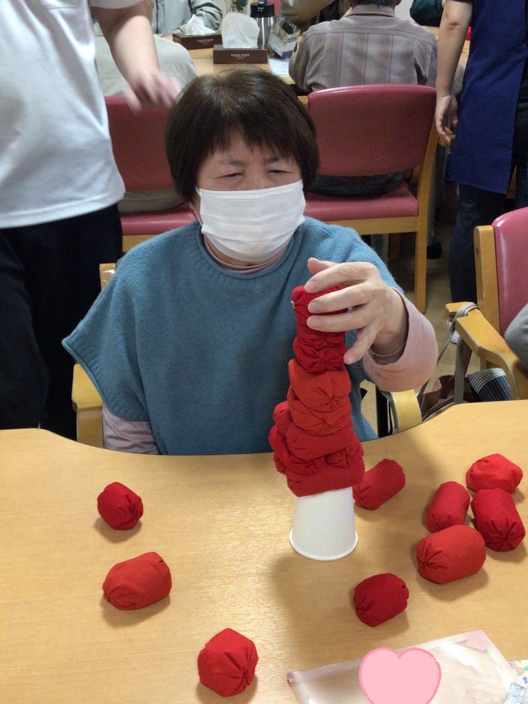 ルールはもちろん簡単。時間内に紙コップの上にお手玉を積んでいく、というもの。