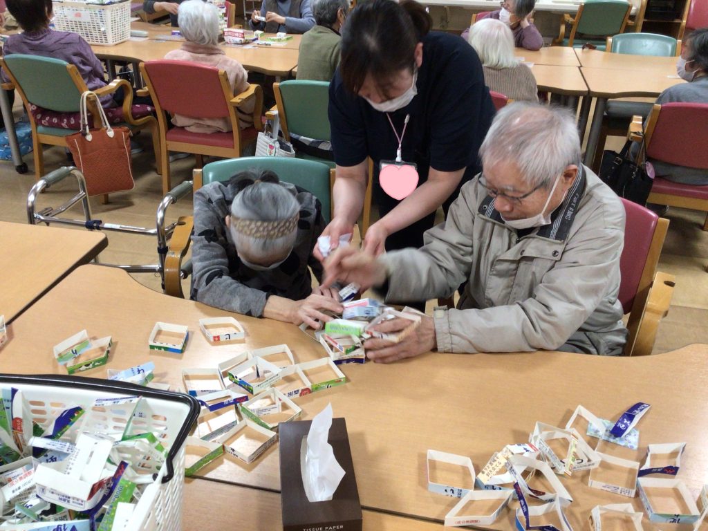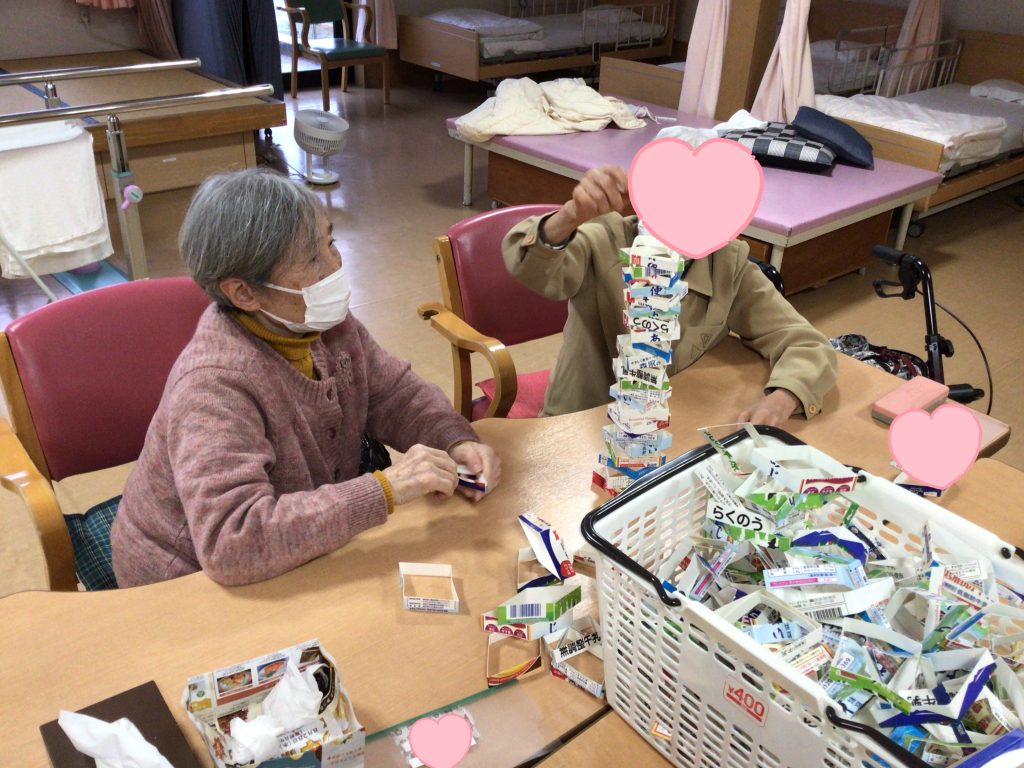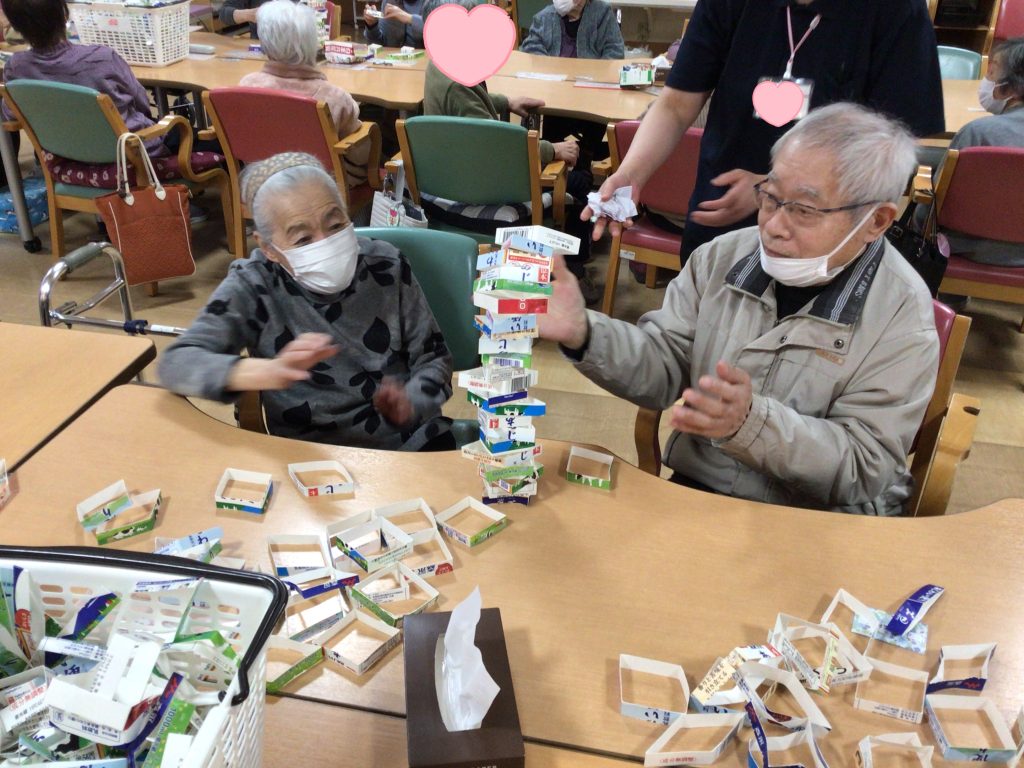 デイ横越で毎度盛り上がるレクのひとつ、牛乳パック積み‼️