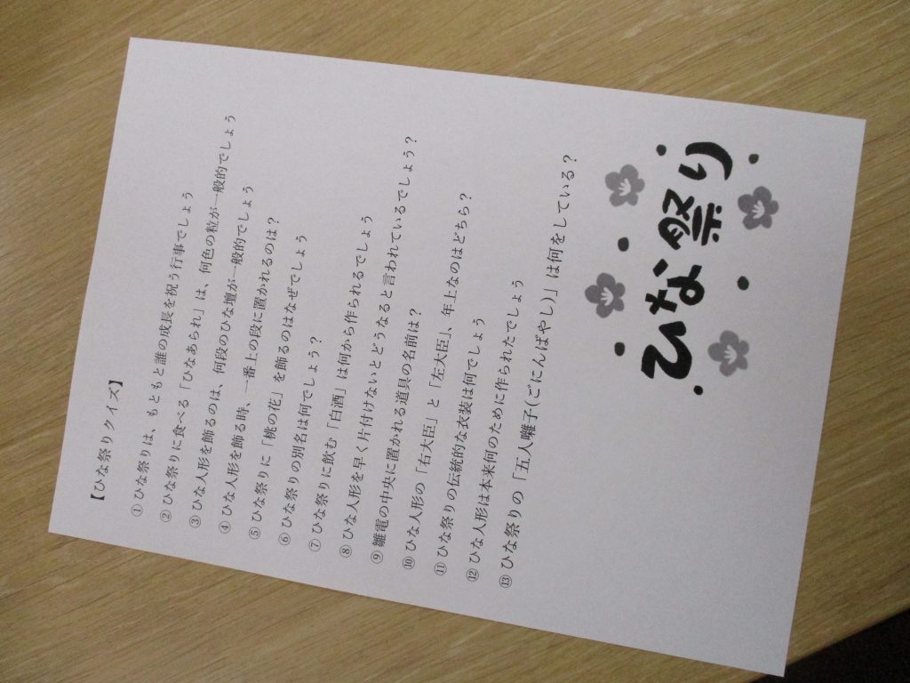 午前中はひなまつりに関するクイズを行いました。
