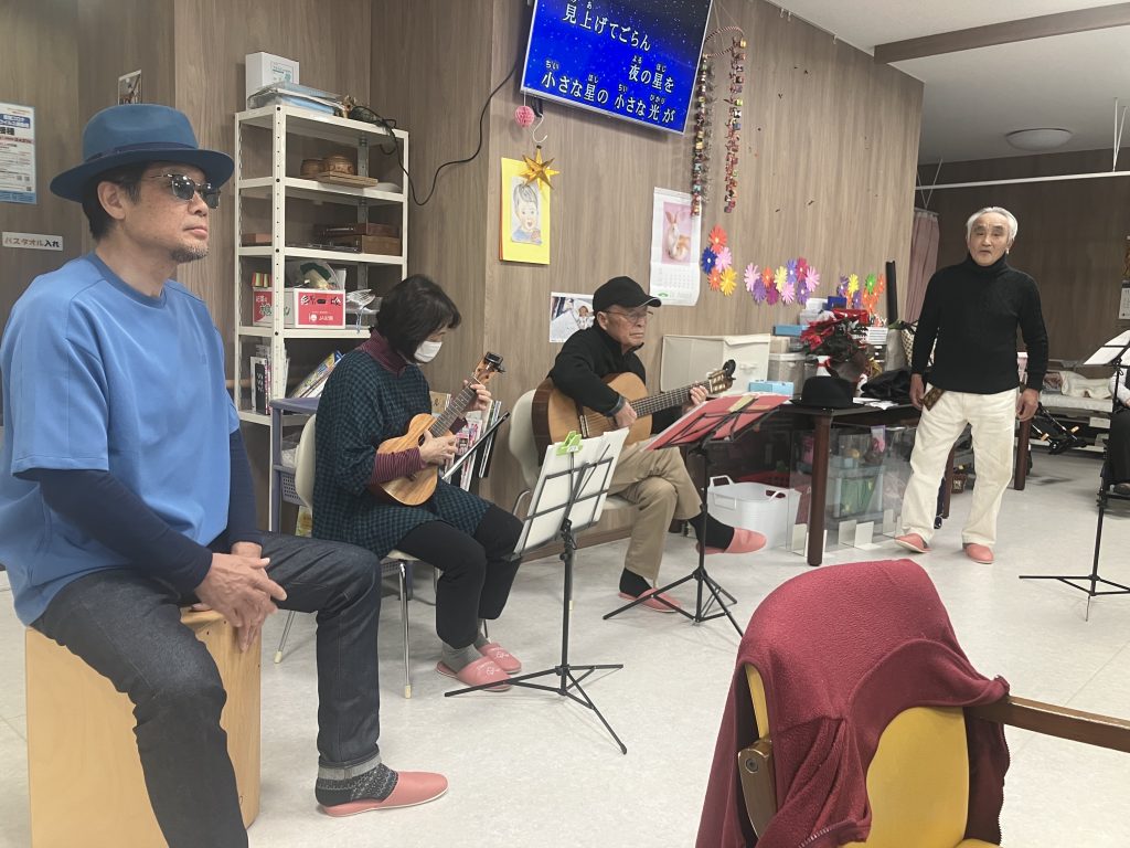 皆様はギターとウクレレの生演奏に合わせて懐かしい歌を歌われました。