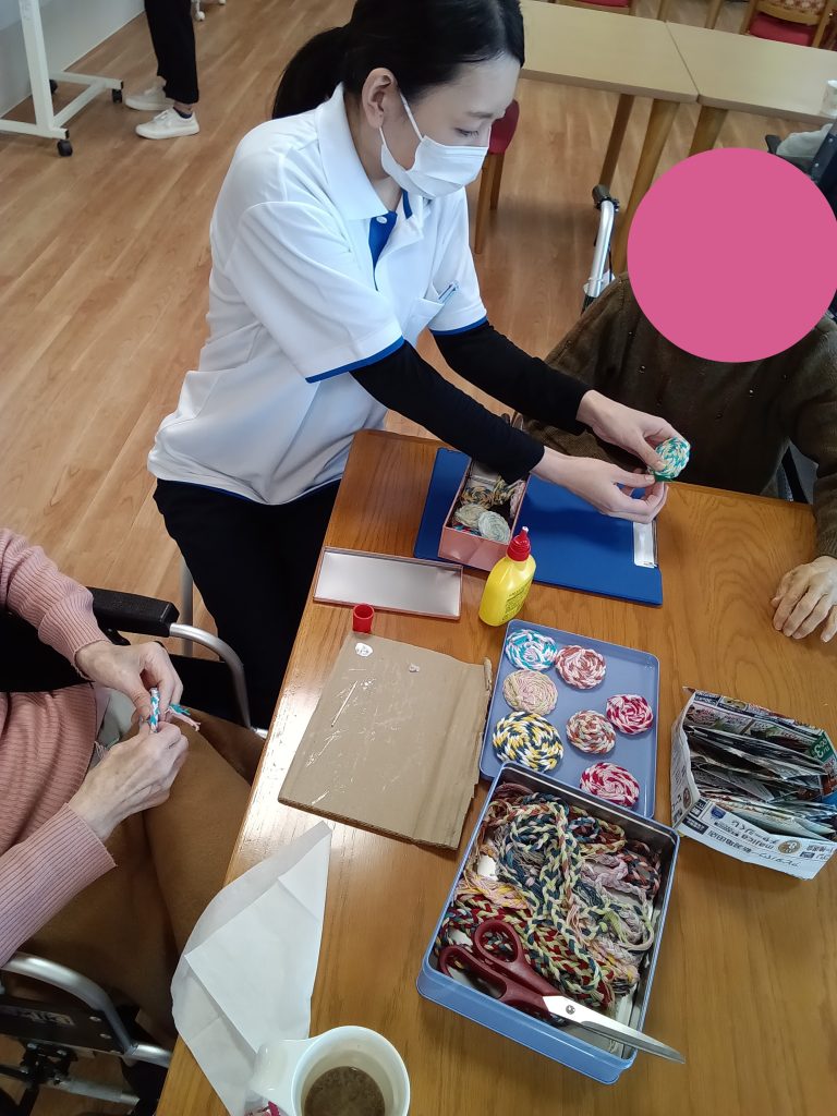レース糸を束ねて三つ編みにしたものを丸め、お花に見立てています✨