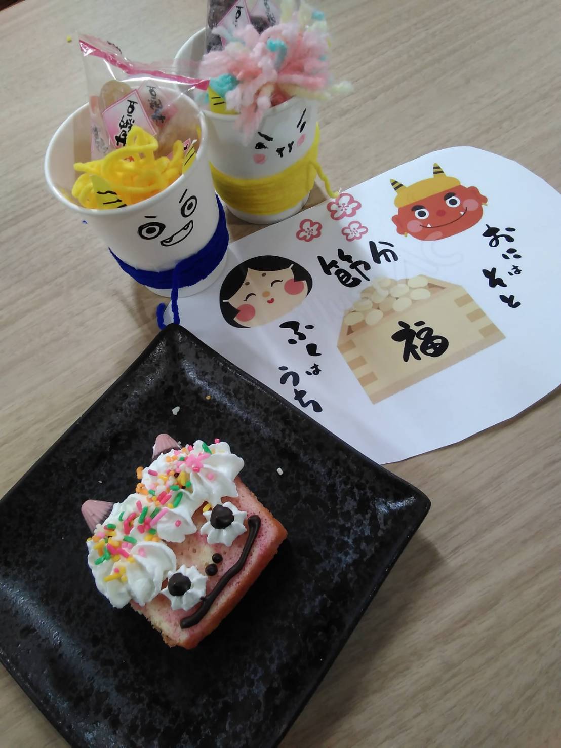 おやつは皆さん作ってくださった鬼ケーキと、鬼カップ入りの甘納豆でした♡