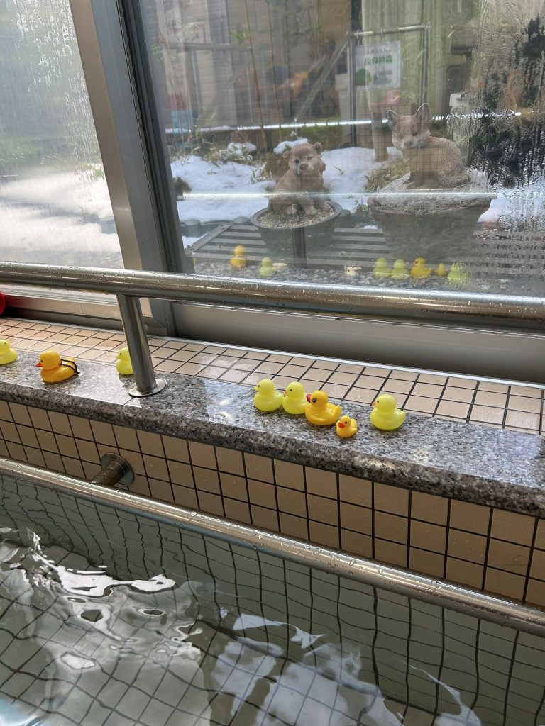 雪見風呂 新発田 今日は雪ちょっと積もりましたね! お風呂入りながら雪見風呂を楽しんでいただきました♪ お客様も足を伸ばしてゆったり眺めていらっしゃる方も😊 置き物ですからね 犬達🐕 アヒル達をみているようです♪