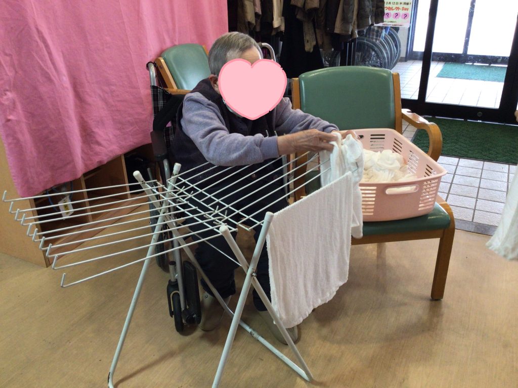 洗濯したタオルを持っている職員を見かけると近くに来て「やるよー」とか「まだあるあらはよ持ってきなせ」とかいつも声を掛けてくださいます😊